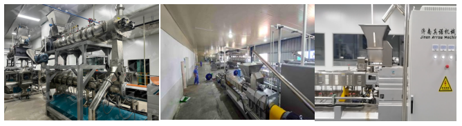 2.挤压膨化环节:双螺杆膨化机对物料施加高压剪切,形成多孔膨化颗粒,同时杀菌灭酶。