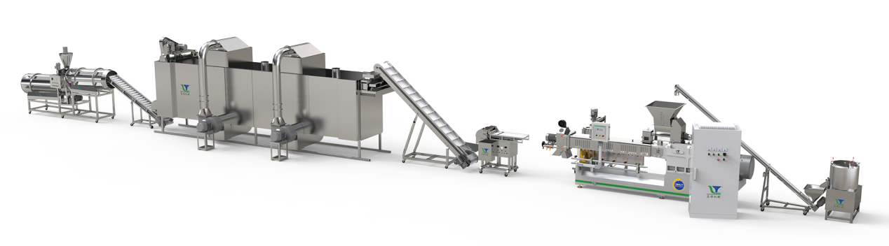 原料(如玉米粉、大豆粉等)被送入机器后,在双螺杆的旋转推动下,经历混合、加热、加压的过程。