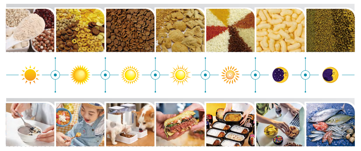 关于挤压机的应用:首先可以做食品,比如主食类-方便米饭、即食面等;早餐类-玉米片、谷物球、代餐粉等;零食类-锅巴、麻花、麦香鸡块、呀土豆等;儿童食品-星星泡芙、营养米粉等;