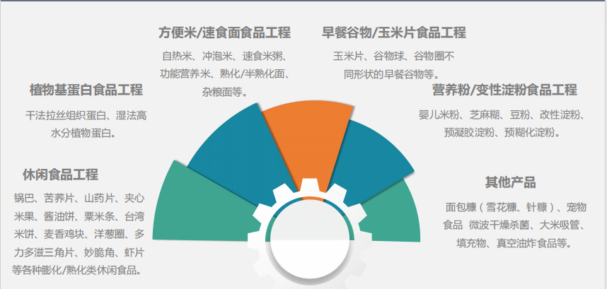 谷物食品传统加工工艺一般需进过粉碎,混合,熟化,成型,烘烤,杀菌、干燥等生产工序,每道工序都需要配设备,生产线较长,占地面积大,用人比较多。采购双螺杆挤压工艺来加工谷物食品,在原料经初步粉碎混合后,可用一台挤压膨化机一次性完成熟化,杀菌、成型、预干燥等工艺,制成膨化或不膨化的产品,经油炸或烘干调味后即可上市销售。与传统工艺相比,双螺杆挤压工艺,缩短了工艺流程,降低了生产费用,降低了劳动强度,提升了竞争优势。